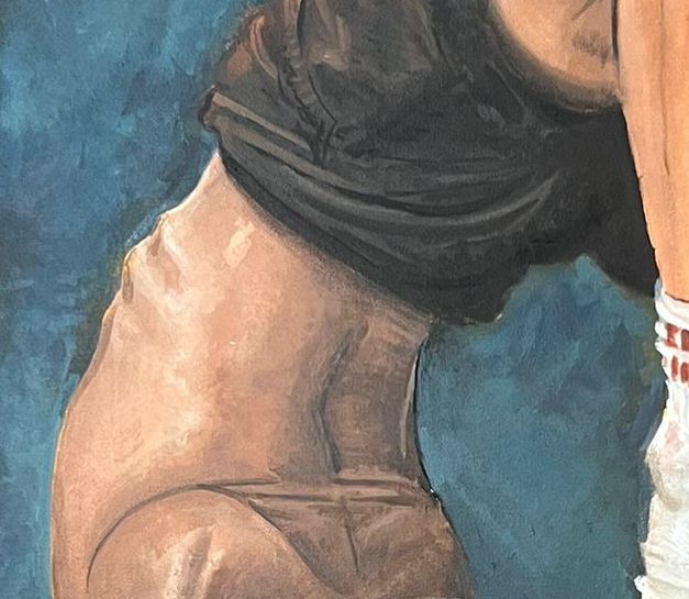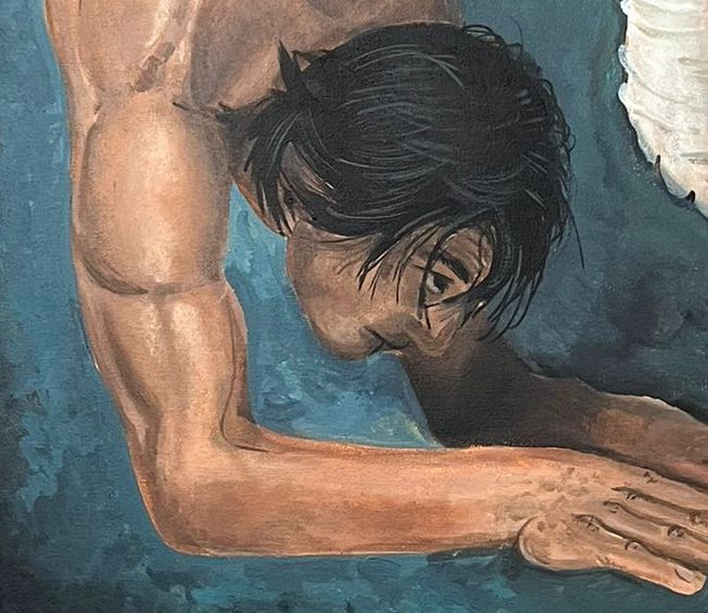 …light touches and interrogates the figure, as if seeking to reveal its deeper essence. Shadow and clarity alternate not to create volume, but to suggest an interiority that dissolves and re-forms. The undefined, almost cosmic background evokes an elsewhere: we are no longer in physical space, but in a mental realm. The contortionist is suspended, waiting, immersed in a time that does not flow. He is pure presence, detached from any narrative…